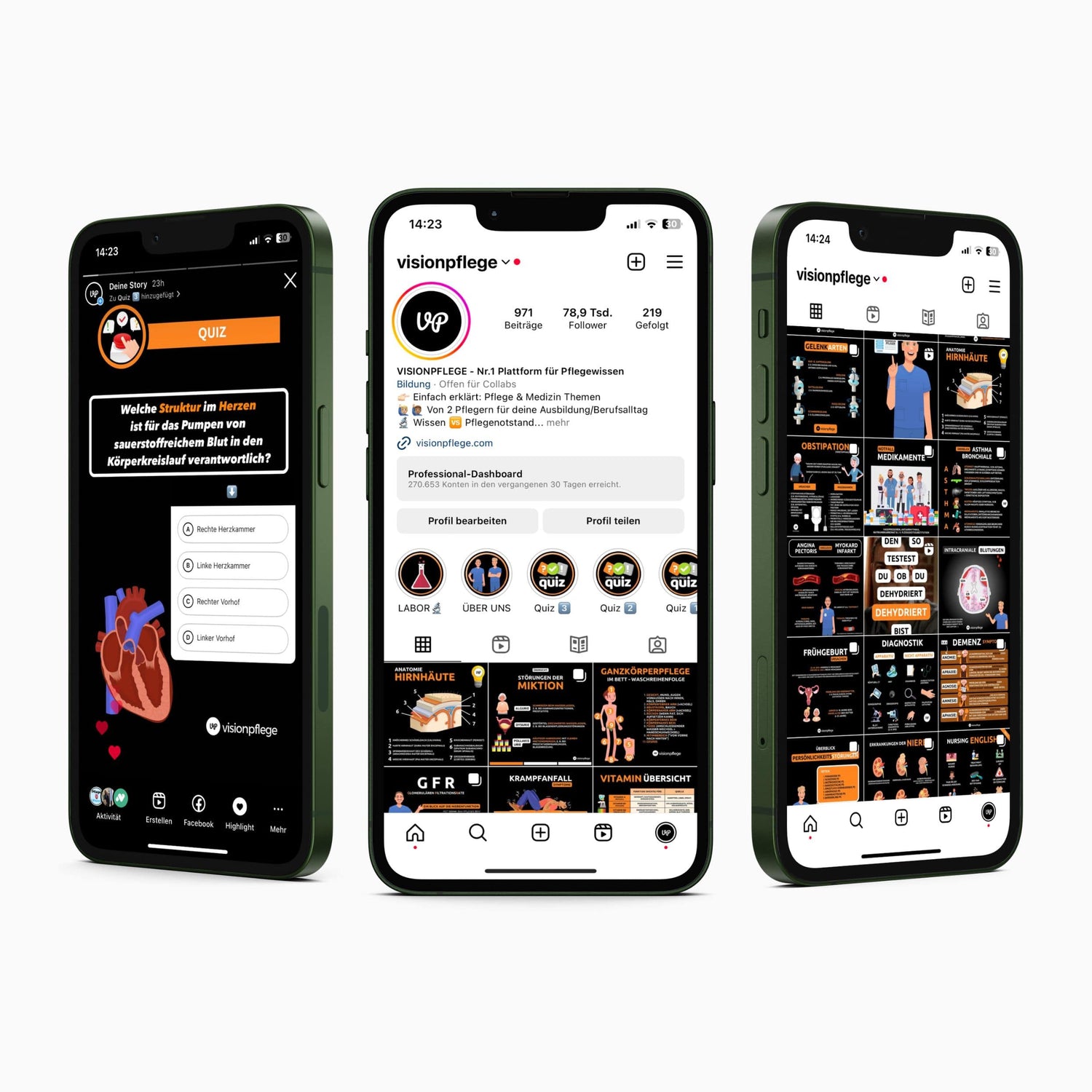 Über 100.000 Pflegekräfte folgen Visionpflege auf Instagram und profitieren von den kostenlosen Inhalten zu Themen wie Krankheitslehre, Behandlungspflege, Anatomie, Medikamentenlehre und Vielen mehr, in Form von Beiträgen, Reels und spannenden Quizfragen.